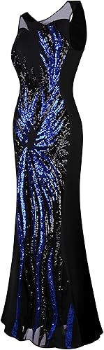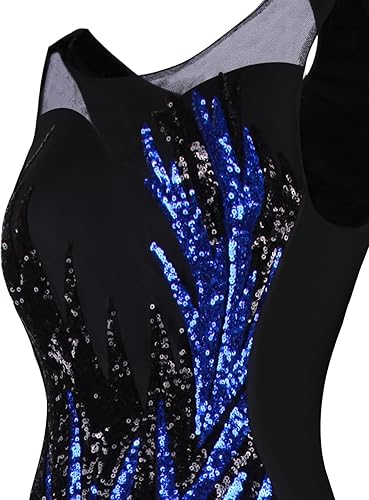 High round neckline, sheer top, long style. Sequined pattern detailed.