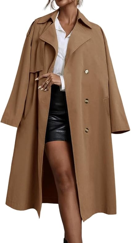 2024Women's Double Breasted Long Trench Coat Lapel Mid Length Jacket with Belt Coat