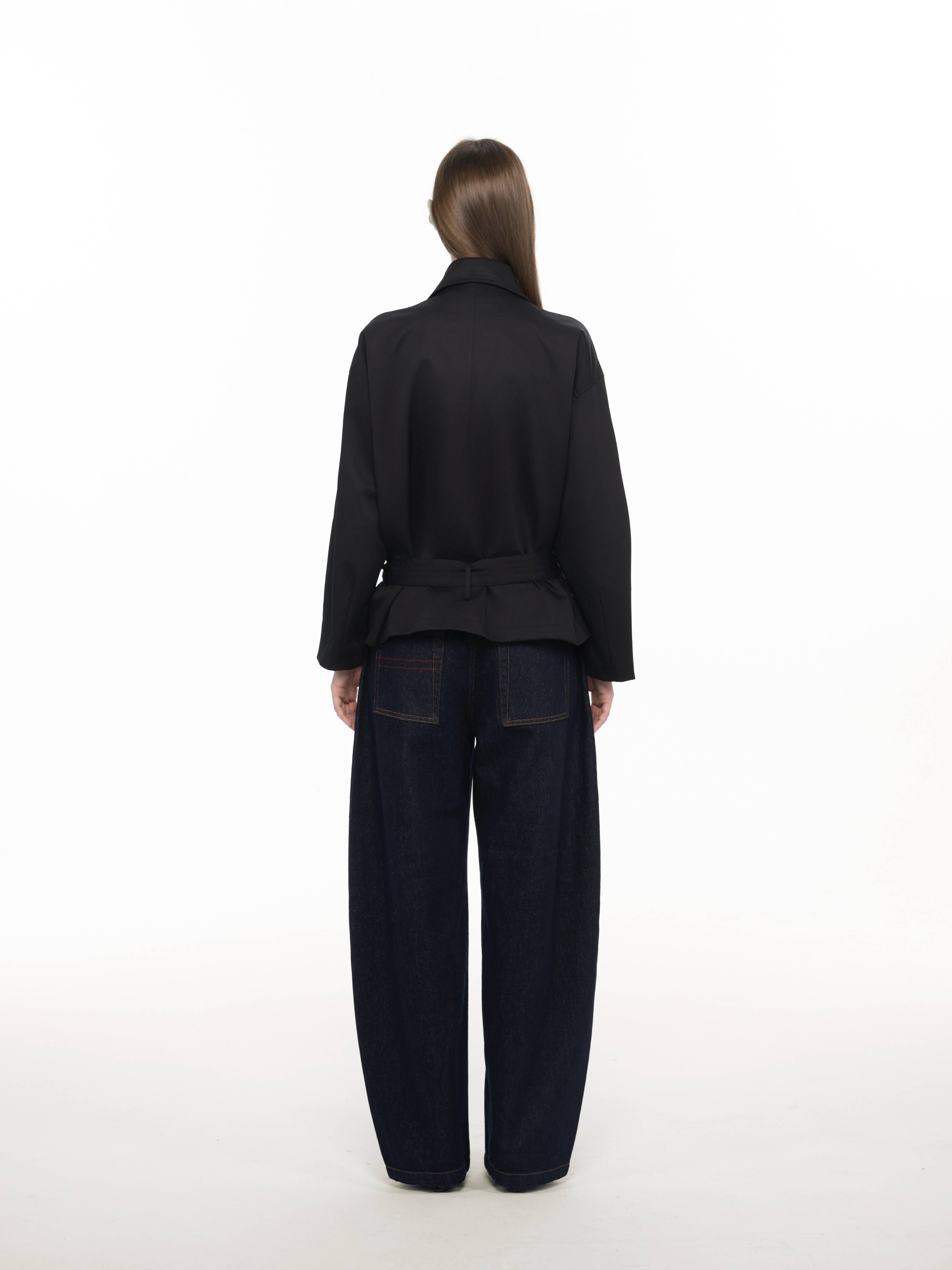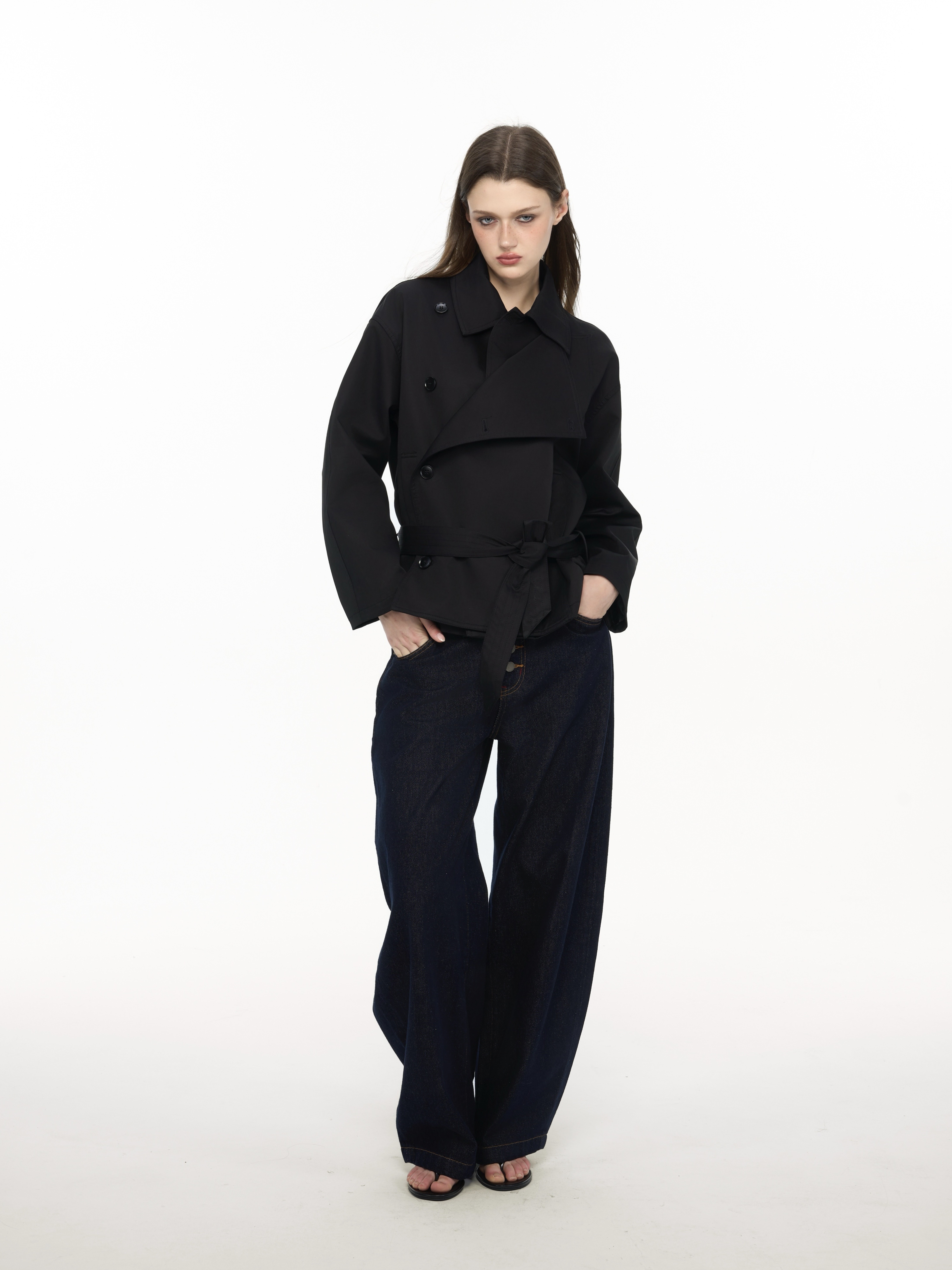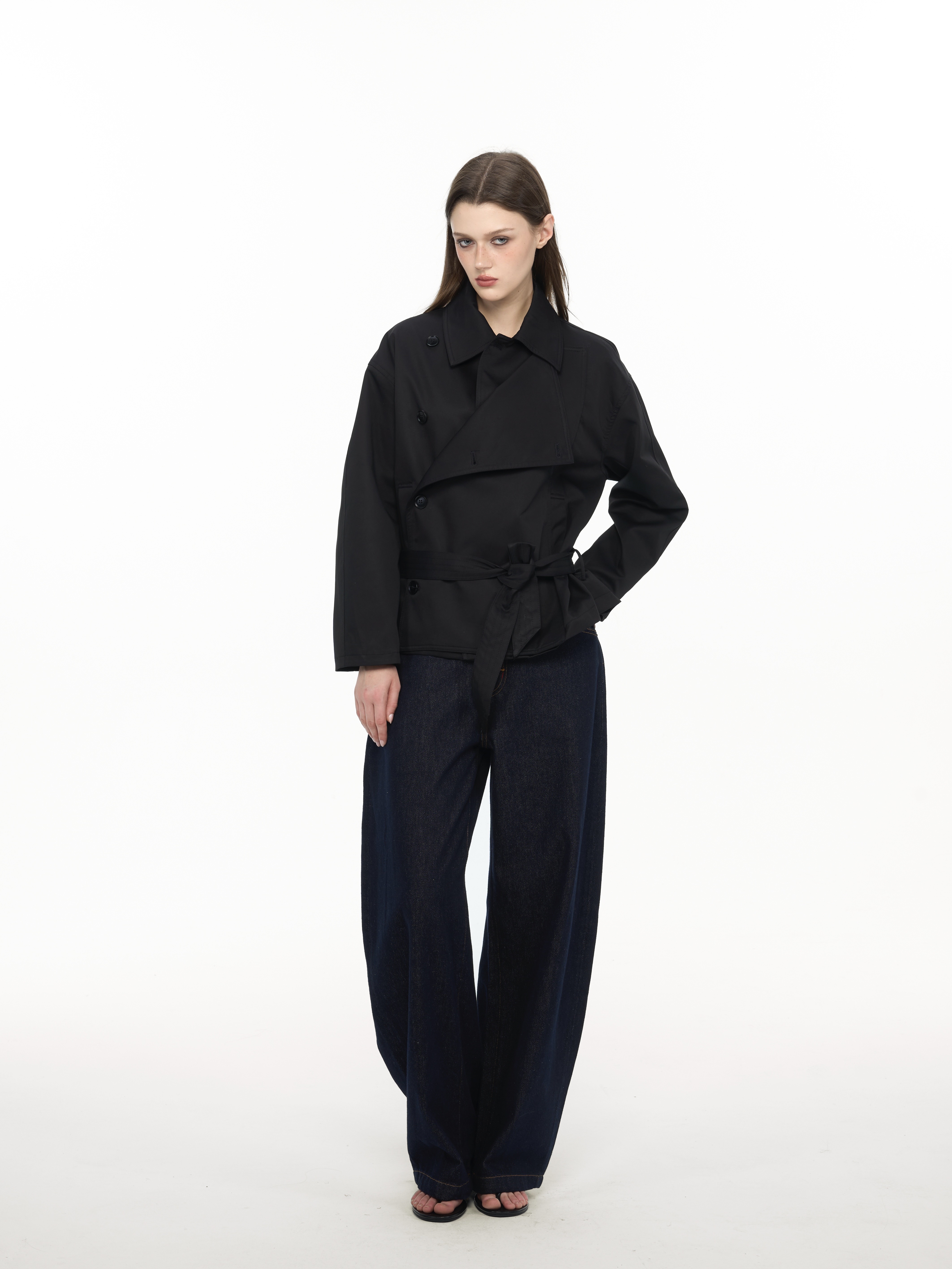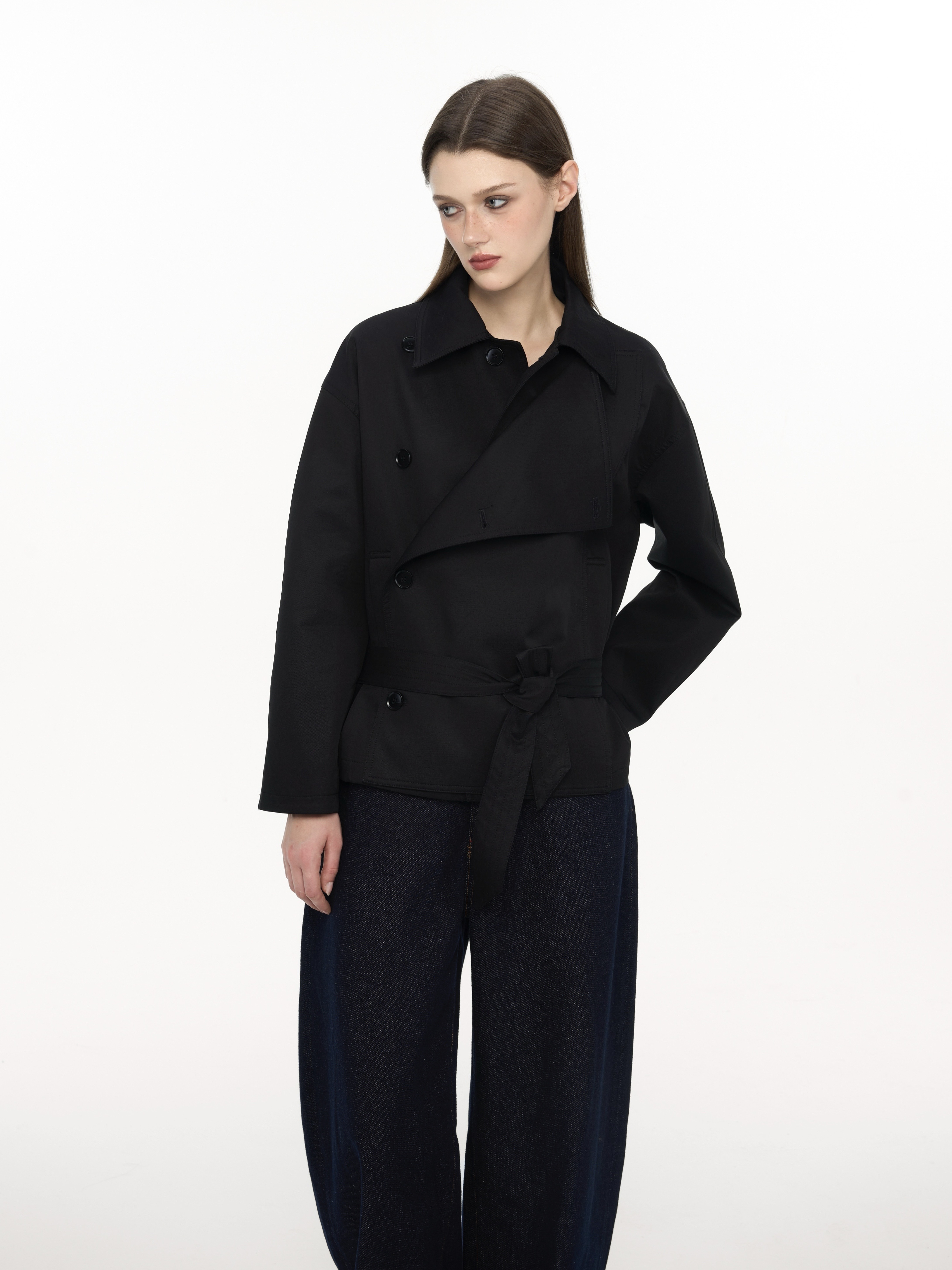 / Women's Short Trench Coat, Double-Breasted Black Jacket with Belted Waist and Stand Collar