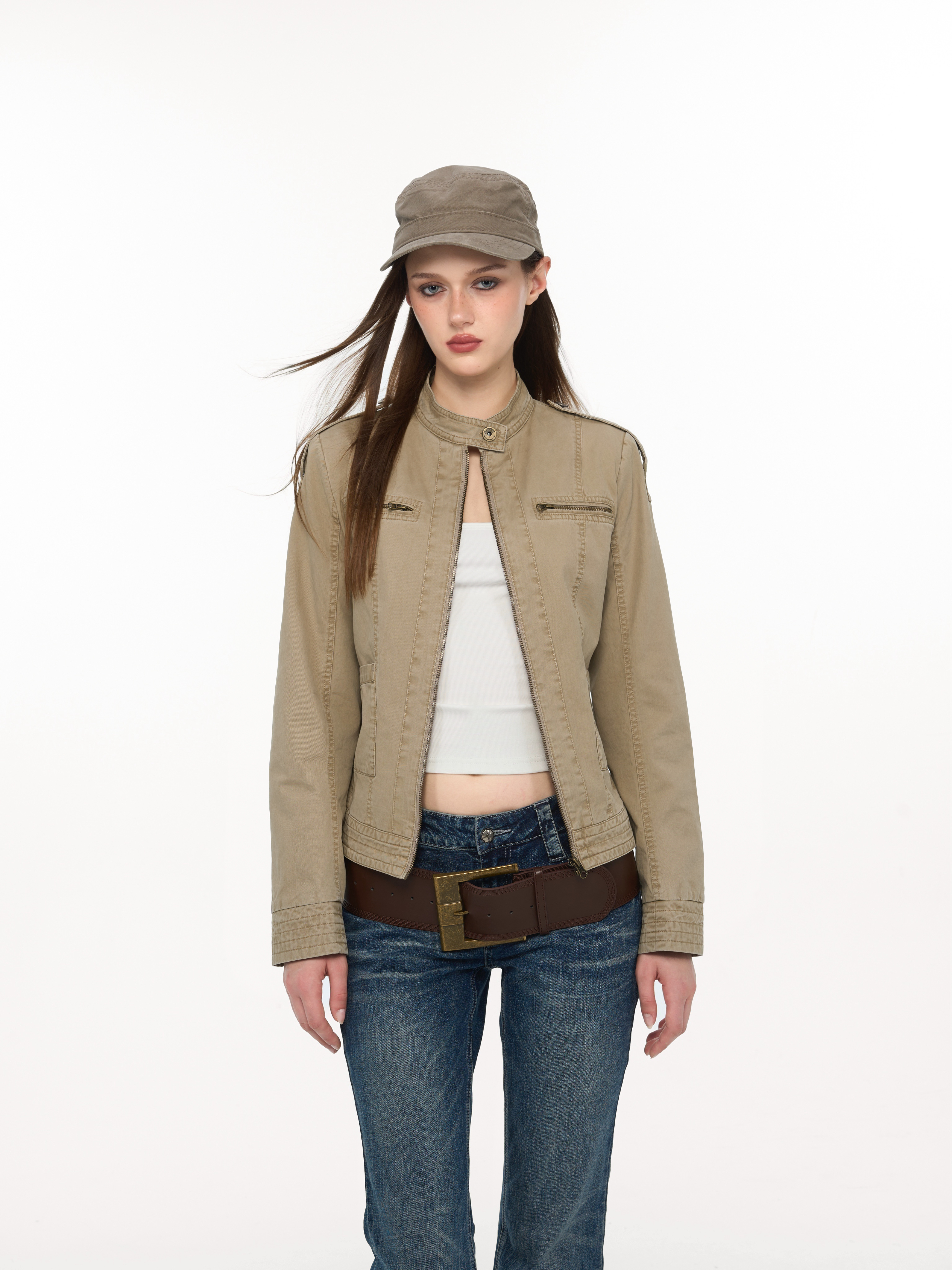 / Women's Cropped Denim Jacket, Utility Style with Long Sleeves
