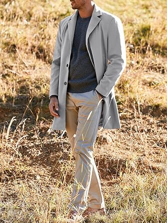 Elegant men's trench coat, single-breasted, with lapel and two side pockets, streamlined back, long regular fit, long sleeves. Men's winter coat for casual wear, business, dating and parties.